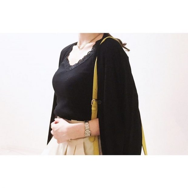 2WAYリブレースタンクトップは、厚めのタンクトップで肩紐がレースになっている人気商品。Vネックと丸襟の2WAYが楽しめます。カーディガンと合わせたシックな着こなしはもちろん、重ね着してカジュアルな雰囲気も醸し出せるお得な1枚です。お値段も1,000円(税別)とプチプラなので、イロチ買いして、とことん着倒したいですね。