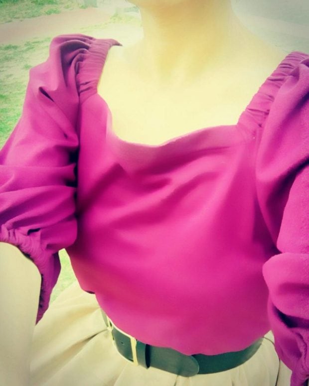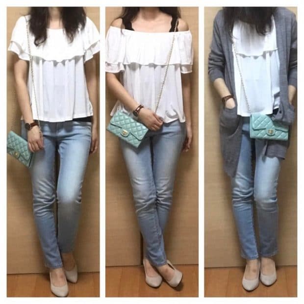 上半身にボリュームを出したくない人は2WAYオフショルダーT(7分袖)はいかが。オフショルダーとスクエアネックの2WAYができます。七分袖なので、冷房が効いた場所では、このくらいの袖の長さが目立たない冷え対策になりそうで◎。オフィスではスクエアネック、退社後のデートではオフショルダーという使い分けもできちゃうニクいアイテムです。こちらも990円(税別)とプチプライス!