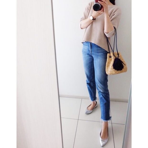 トップスは淡いピンクですが、ヘリテージデニムとシルバーのバレエシューズで、ほどよい辛口加減のきれカジコーデに! ビッグフェイスの時計や華奢なブレスレットなどの小物にもこだわると、より大人っぽくなりますよ。