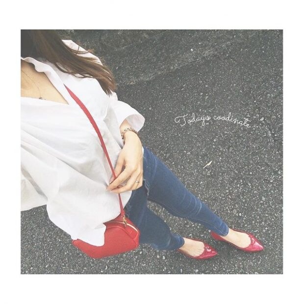 白シャツ+デニムのシンプルコーデに、赤で統一したバッグとバレエシューズを合わせると、一気に上級者コーデになります。ちょっぴり辛口になるので、デコルテを出して女性らしさをアピールすると◎。