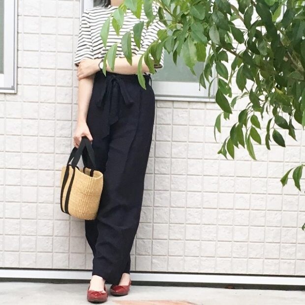 モノトーンのボーダーシャツとネイビーのワイドパンツに、赤のバレエシューズを合わせてトリコロール風に! リネンのパンツとかごバッグの素材が、より夏らしさを強調します。