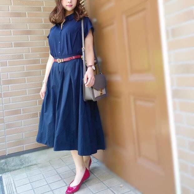 ふわっと広がるAラインワンピースに、ベルトとバレエシューズでアクセントを! ネイビー×赤の上品な組み合わせで、好感度バツグンの女子会向けコーデになります。