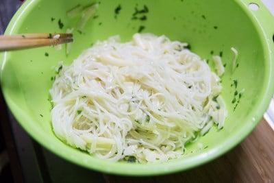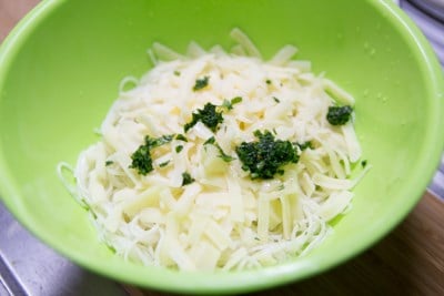 2 )そうめんを入れたボールに刻んだバジル、とろけるチーズ、塩、ニンニク、オリーブオイルを投入。