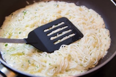 4 )オリーブオイルを多めに引いたフライパンに、先ほど混ぜ合わせたそうめんを投入。フライ返しを使って引き延ばしながら焼いていきましょう。