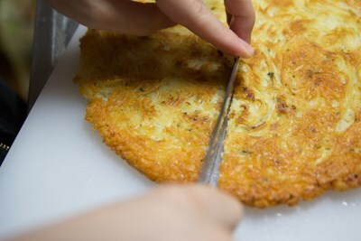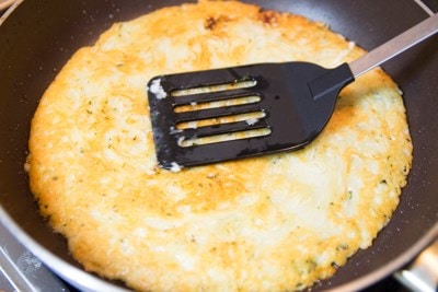 5 )裏面がカリカリに焼けているのを確認したら、お好み焼きの要領でひっくり返します。