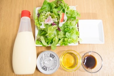 4 )先ほど和えたそうめんサラダと残りの生野菜、ツナを盛り付け、マヨネーズをたっぷりかけたら完成です!