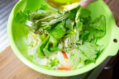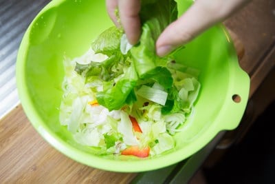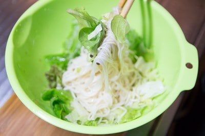 1 )次は余ったそうめんと生野菜で作る、ずぼら「そうめんサラダ」にチャレンジ。まずはそうめんが入ったボールに生野菜を半分ほど投入します。