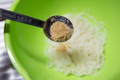 1 )水を切ったそうめんをボウルに入れ、その上から「ダシダ」を小さじ1/3ほど投入。濃いめの味付けがお好きな人は、小さじ1/2がオススメです。その後、そうめん「ダシダ」を“ダマ”にならないよう良く和えます。
