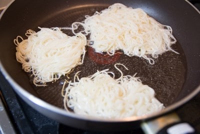 2 )多めのサラダ油を引いたフライパンで、先ほど和えたそうめんを揚げ焼きにします。ひっくり返しましょう。