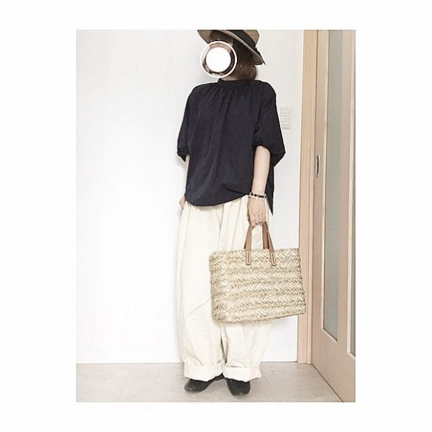 カジュアルに着こなすならトップスはインせずに着てみて! サイドにスリットが入ったデザインなので、そのままでもスッキリ着られるんです。かごバッグとカンカン帽で夏っぽさを上げていこう!!