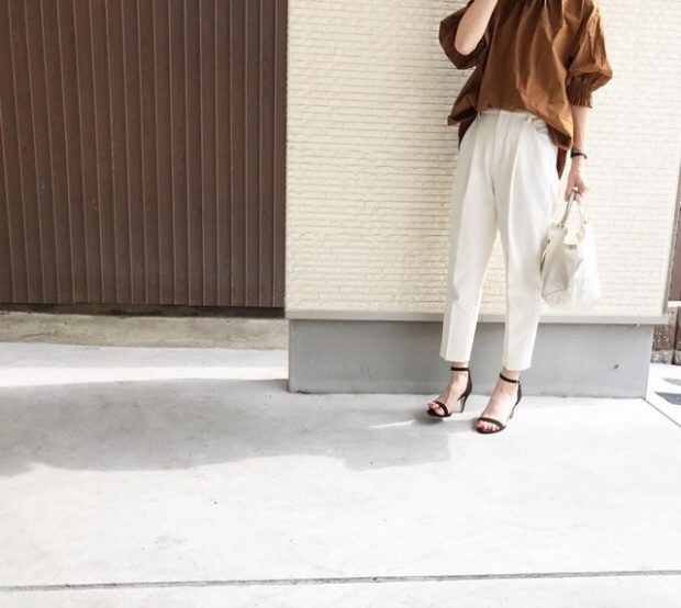 清潔感と爽やかさを兼ね備えたホワイトパンツと合わせた魅力的なコーデ。トップスは前だけインして、スタイルアップしつつも気になるヒップ周りはカバー。ブラウスの袖はちょっとたくし上げると印象が変わるのも、このブラウスの人気の秘密!