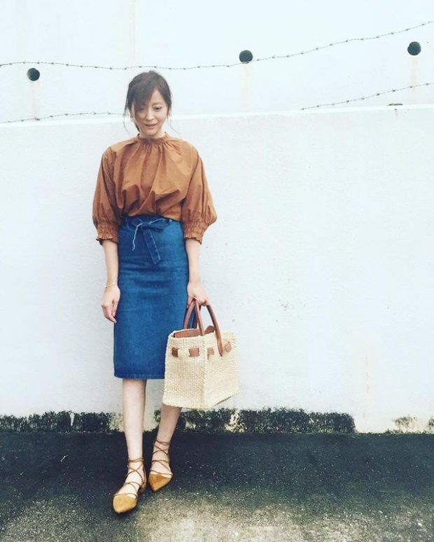 落ち着いた大人コーデがお好きなあなたはブラウンがオススメ! デニムスカートを使ったカジュアルコーデも高見えに導いてくれるカラーなんです。カゴバーキンのチョイスで、レディな雰囲気に♪