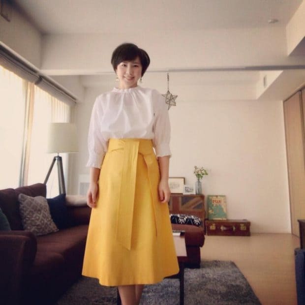 ネイビーも合わせやすく使いやすいカラー。インパクトがある派手カラーを合わせても絶妙に引き立ててくれますよ。袖にボリュームのあるブラウスなので、視線も上向き。さらにハイウエストスカート&ヒールを合わせることでスタイルアップ効果はバッチリ!