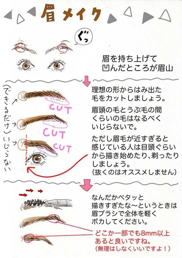眉山の位置は、眉毛を「グッ」と持ち上げて凹んだところです。あとは、理想の形からはみだしたアウトラインの眉毛をカットしましょう。眉毛がものすごく濃い! という人以外は、できるだけ眉毛自体の長さはいじらずに自然なままをキープするのが、平面的にならないのでオススメです。