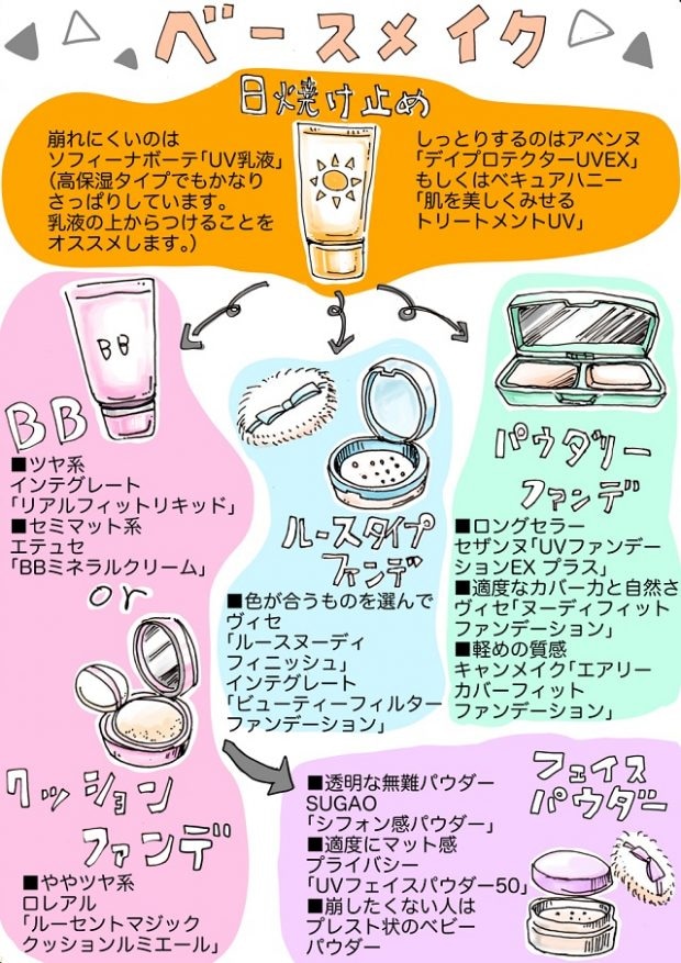 まずは、日焼け止めは必ず塗りましょう。そのあとは、コンシーラー、BBクリーム、ルースタイプのファンデーションなどを使用感や仕上がりの好みでセレクトしてみて。どのアイテムも各メーカーが推奨する「適量」をしっかりと意識しましょう。詳しくはこちらの記事をみてください。