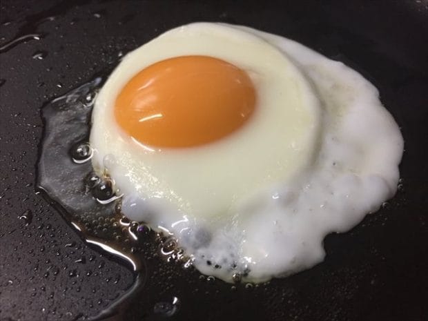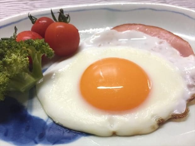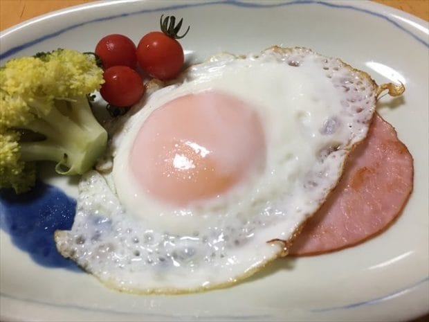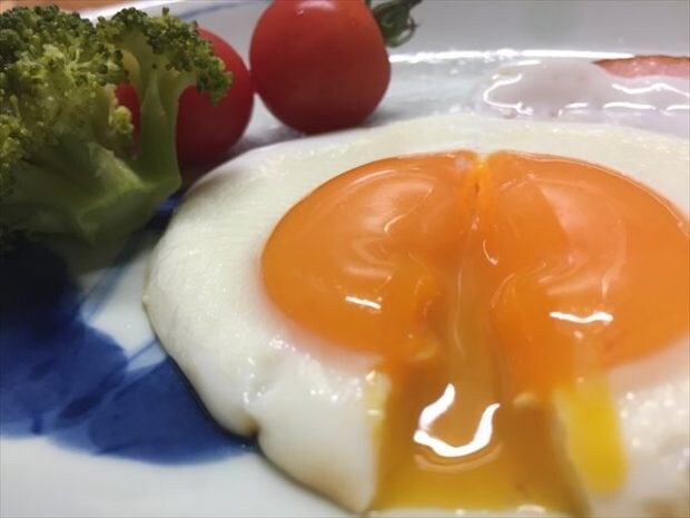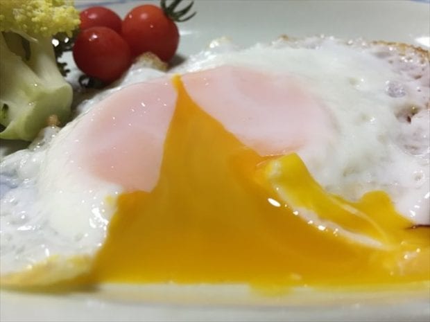 こちらはいつも通りのやり方でパパッと作った目玉焼き。卵を低くない位置からフライパンに割り入れ、中~強火で焼き、水を入れてフタをして蒸し焼きに。3分ほどでできちゃいました。