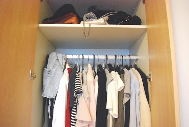 種類の違うハンガーがゴチャゴチャ! そして上の棚には物をポンポン投げ入れています……。