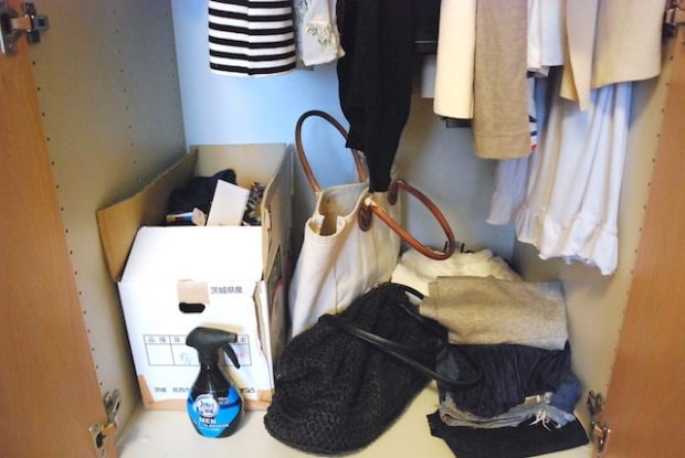 下は細かい物を入れるダンボールとバッグ、洋服を床に直で置いています。