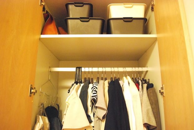ハンガーを揃えるだけでこんなにスッキリ! さらに上の棚もCan Doで購入したケースに分け入れるだけで、より多くのものを収納することが可能に!
