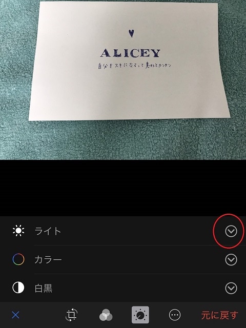 ライト、カラー、白黒と3種類のメニューが表示されます。ライトのチェックマークをタップすると、さらに明るさ調節のメニューが表示されます。