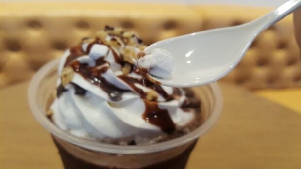 真夏に似つかわしくない、チョコレート色の重厚なベース。しかし、今回のフラぺではミルクを使っていないことで舌にまとわりつく濃厚さが少なくなっています。