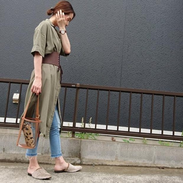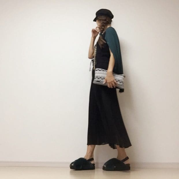 スリッパミュールの中はファーになっていないので、夏の気配が残る時期でも気軽に履けるのがポイント。トーンを抑えたワンピース×コルセットベルトのスタイリングに、ファーをプラスして旬な着こなしに。カラーはイエロー、ダークグレー、ブラック、ブラウンの取り扱いがありますよ。