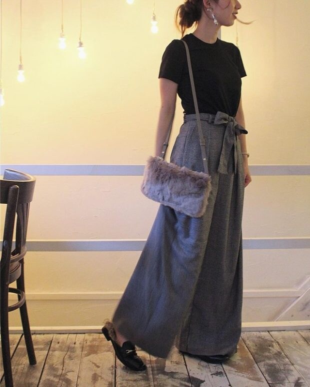 楽に履けるのに、きちんとコーデに見えるローファースリッパは大人コーデの味方になりそう。主張しすぎないファーアイテムで、さりげなく季節を意識して。こちらも大注目のグレンチェックのパンツとの相性も◎。カラーはダークグレー、ブラック、ブラウン、イエローの4色がありますよ。