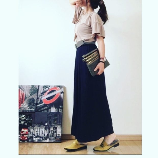 マスタードカラーに近いイエローは、レディ感を上げてくれるカラー。まだまだトレンドの袖コンシャストップス×スカンツに合わせて女性らしいコーディネートに。クラッチバッグや太めのベルトで、メリハリを付けたスタイリングがステキ♪
