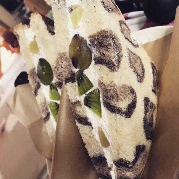 こちらはなんと手作りのヒョウ柄模様の食パンでサンド! 他にはないインパクト大のフルーツサンドです。