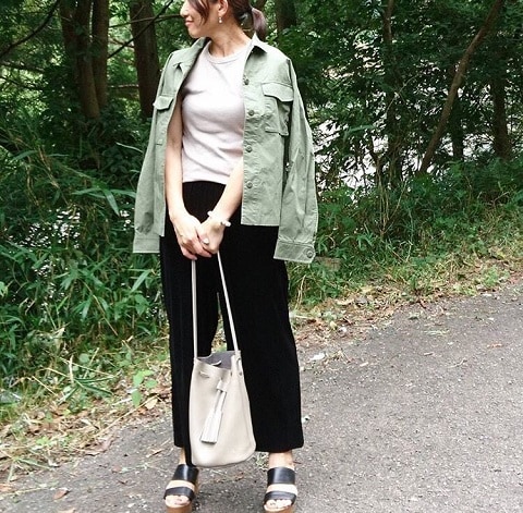 ワントーンでの統一やクラッチバッグで、女性らしさを残して。