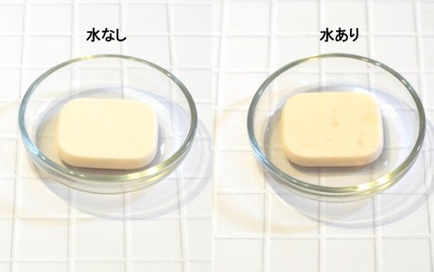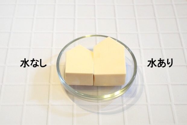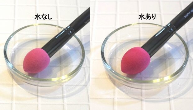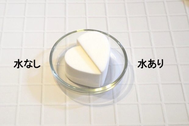 今回は水ありスポンジしばりで使い心地を検証するため、四角形の水ありパフから挑戦。水を含ませましたがあまり吸い込まず、見た目の変化もほぼなし。