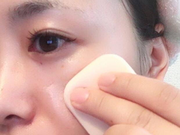 頬に当ててみるといつもと違いひやっとした感覚。ベースは薄づきで伸びました。四角形のパフは肌の広範囲を塗ることは得意ですが、やはり口周り、目元、小鼻の細かい部分の塗り残しが心配で、最後まで気を抜けなかったです。