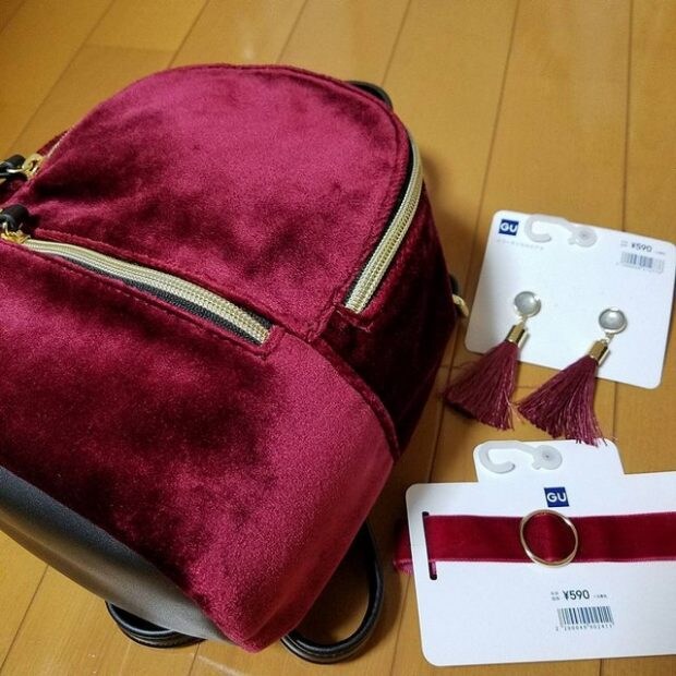 小物も豊富なGU! ベロア素材のワインカラーなら、秋らしさ&上品さも演出できます。リュックサックやアクセサリーで取り入れれば、差し色効果も抜群。アクセサリーは590円、リュックサックは1,990円(以上税抜)。