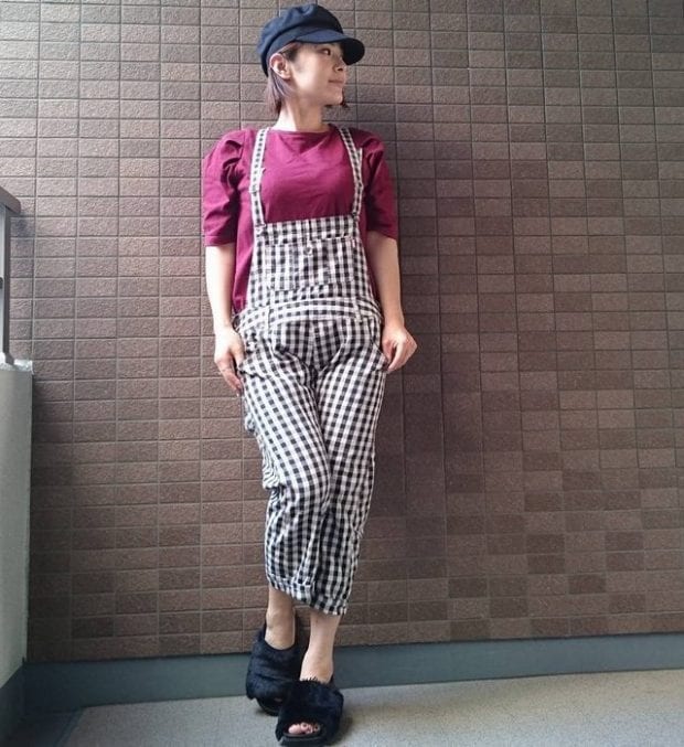 サロペットスタイルにもワインカラーをプラスして。幼くなりがちなコーデもカラーに気を付ければ大人っぽさを盛り込め、高見えコーデに大変身しますね。