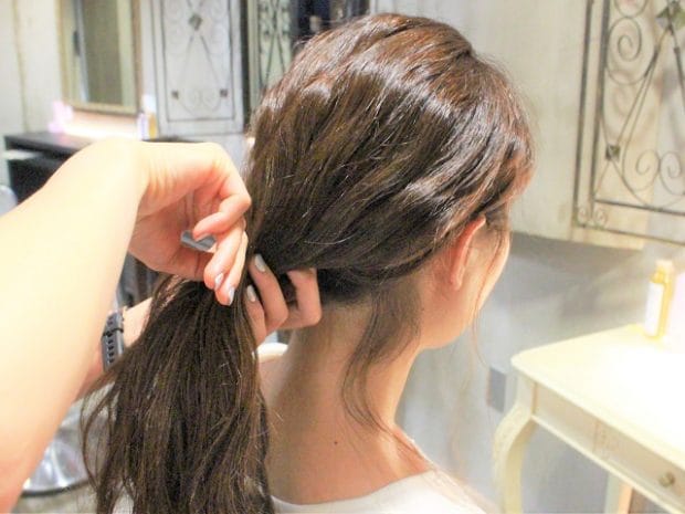 まずは、分け目を作らず、髪の毛を1本にまとめます。まだゴムはいりません。