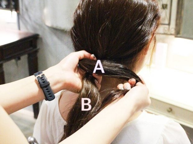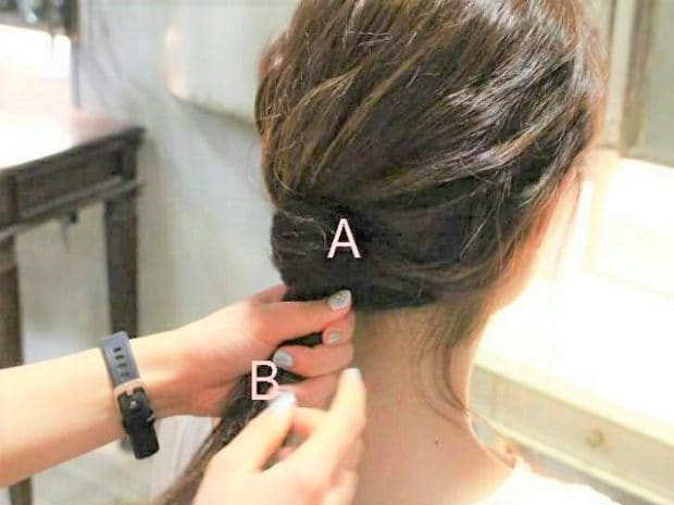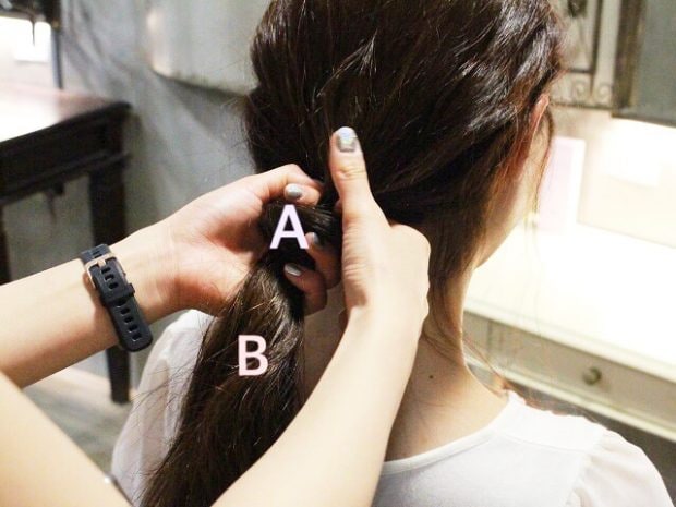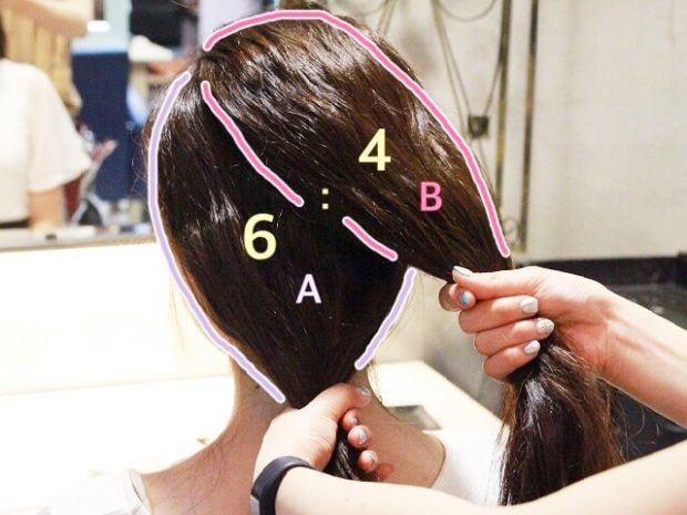 1本にまとめた髪を、斜め方向を意識して2つに割りましょう。Bの髪は左ハチ上から右耳上くらいを取るように。割合は下(A):上(B)=6:4がベスト。