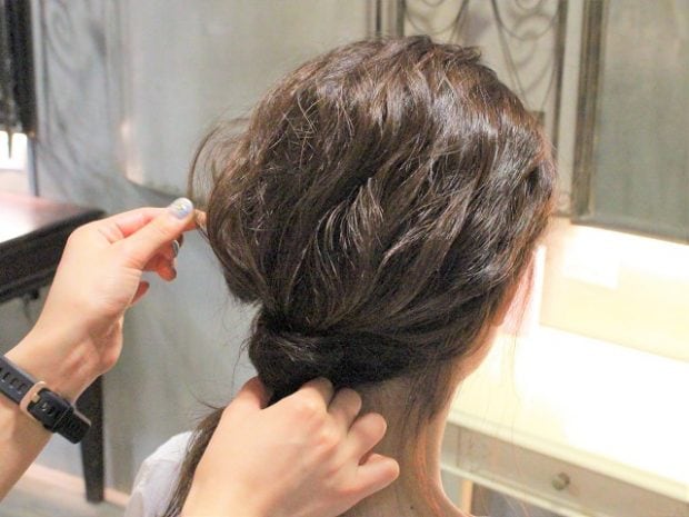 最後にバランスをみつつ、全体をゆるめていきましょう♪ 毛先ではなくて、根元から髪の毛をつまみ出します。欲張りすぎると形が崩れちゃうので注意です。耳上と耳後ろの毛も少しつまみだし、抜け感を演出してください。この後れ毛が色っぽい!