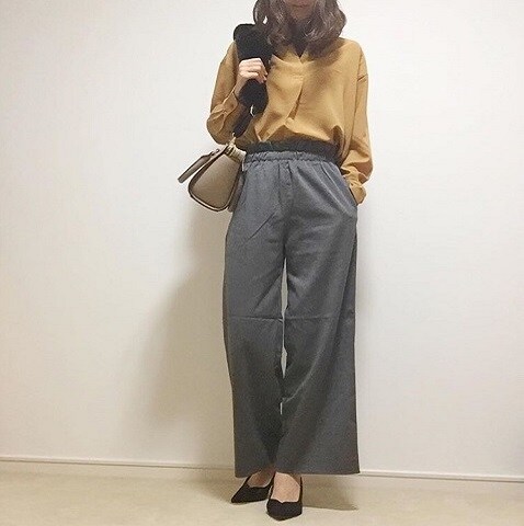 マスタード色が素敵なシャツは、グレーのパンツに合わせることでぐっと引き立ちます! バッグのファーもおしゃれです。