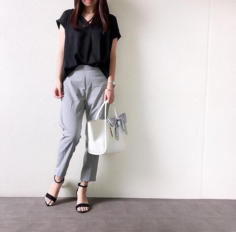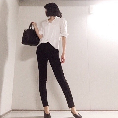 白シャツに黒パンツを合わせたコーデは、とろみシャツだからこそかっちりしすぎず、大人の余裕が垣間見えます。