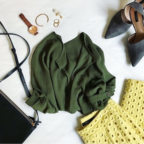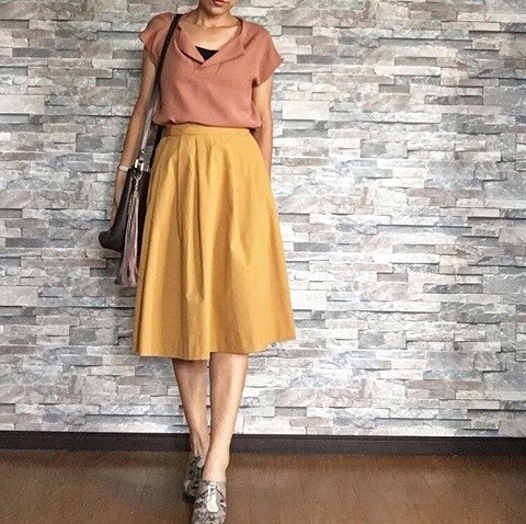 カーキにイエローの色合わせが素敵。靴とバッグの色をリンクさせることでコーデにまとまりが生まれます。