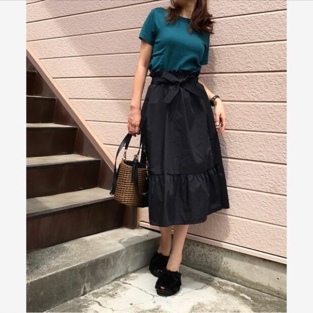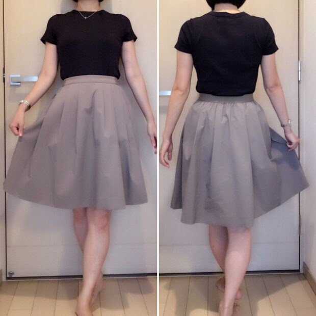リブTシャツとAラインのスカートのタッグで、着やせコーデの完成。上下ユニクロのコーデなんですよ。イージーケア加工がプラスされているから、ズボラさんでもいつもキレイなシルエットをキープできます!