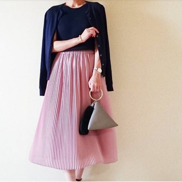 重めになりがちなロング丈でも軽やかに着こなせるシフォンプリーツスカート。総ゴムだから、気負わずゆったり着られます。ネイビー×ピンクの組み合わせで、大人ガーリーなスタイリングに。