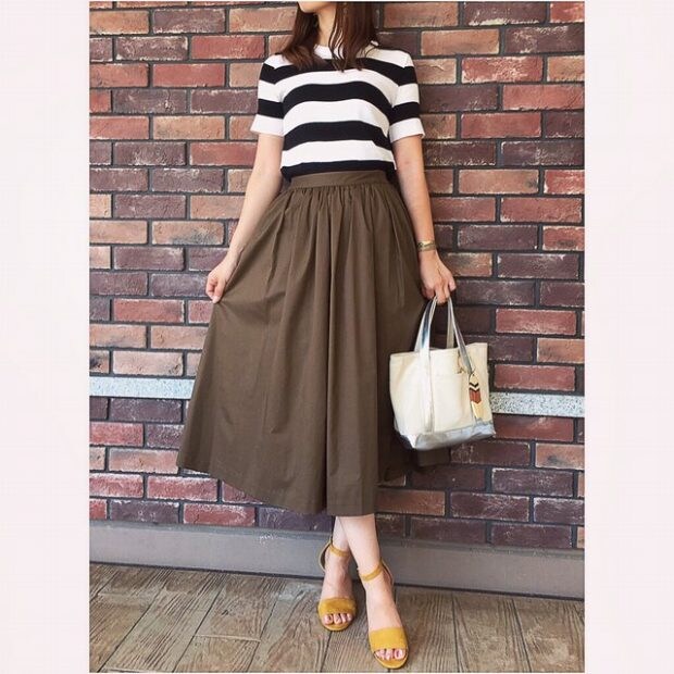 ボリューム感のあるスカートは、カジュアル要素の強いボーダーTとのタッグでも女性らしくキマるのがポイント! シワになりにくい素材で、デイリーコーデにも使いやすいのもうれしい。マスタードイエローのサンダルをポイントにしたステキコーデ♪