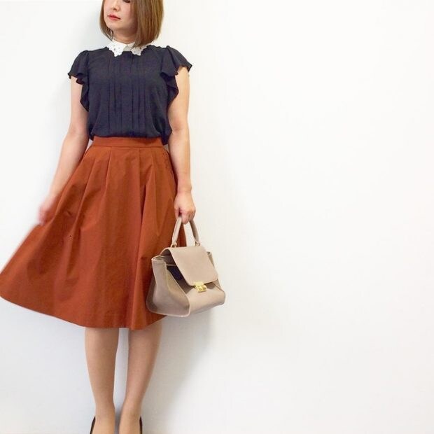 カジュアルスタイルにもオフィススタイルにも使えるタックスカート。ドライ機能が付いているから、まだ汗をかきやすい今のシーズンでも、涼しく着られます。ネイビーとブラウンの色合わせで秋を感じるコーディネートに。