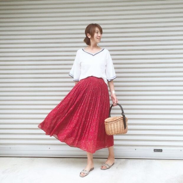落ち着いた色合いのレッドカラーは女っぷりを上げてくれるカラー。袖コンシャストップスとの合わせで、華やかなスタイリングに。ドライ機能が付いているので、暑くなりがちなロングスカートも快適に着られますよ。価格は2,990円(税抜)。