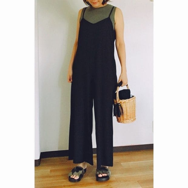 カーキ×ブラックの配色がカモフラ柄とリンクしたスタイリングは大人の遊び心溢れるコーデ。肌寒くなってきたらカーディガンをさっと羽織ればOK!