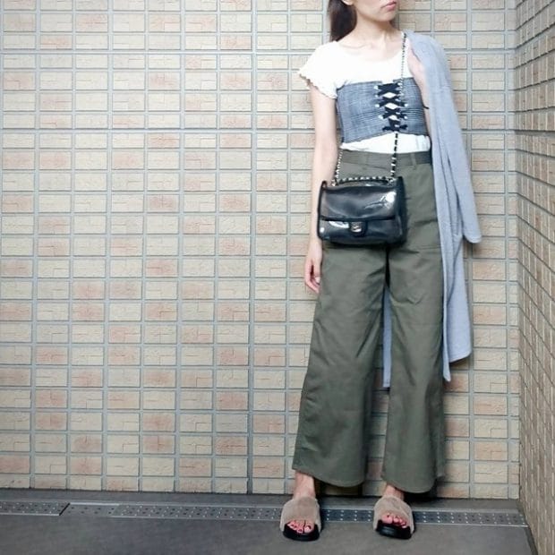 チェック柄のビスチェスタイルは、ファーサンダルで季節を意識してみて。ワイドパンツ×ビスチェ×ファーサンダルのタッグで最強のトレンドコーデの完成!