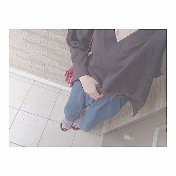 Vネックのトップスにデニムを合わせたコーデはグレーのファーサンダルで軽さをプラス。差し色で派手カラ―のバッグを持てば、一目置かれるステキコーデになりますね。