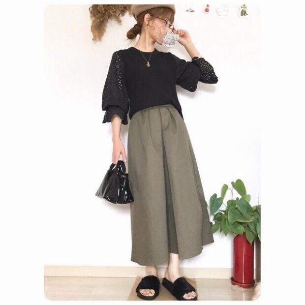ブラック×カーキの秋らしいコーデもステキ♪ フェミニンなレースのトップスにファーサンダルを投入して、さらにキュートなコーディネートに。ポイントでベレー帽をプラスすれば、秋っぽガーリーコーデに。