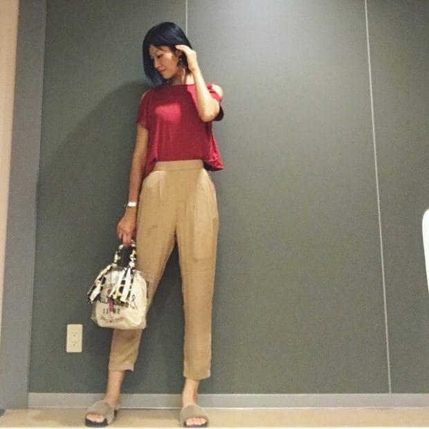 秋カラ―と馴染みやすいベージュ。深みのあるレッドとチノパンの組み合わせがオシャレ。コーデのさりげないポイントになっているクリアバッグはなんとダイソーのアイテム。トレンドはプチプラで取り入れちゃおう。